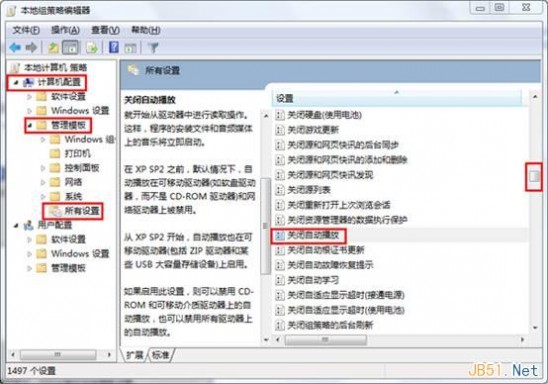 2.打开本地组策略编辑器后,从左边栏目依次进入“计算机配置” — “管理模块” — “所有设置”,在右边栏目中双击“关闭自动播放”选项,如下图所示