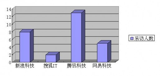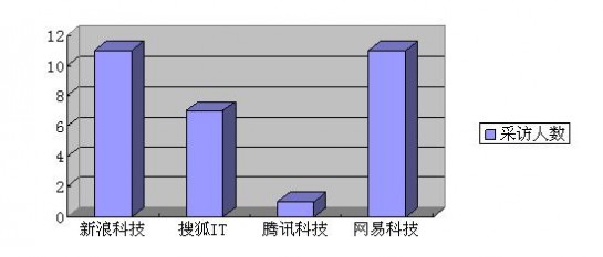 从采访人数上来看,网易和新浪并列第一。腾讯科技在这方面的资源和能力都比较差远远落后其他三家。(见图1.1.3)