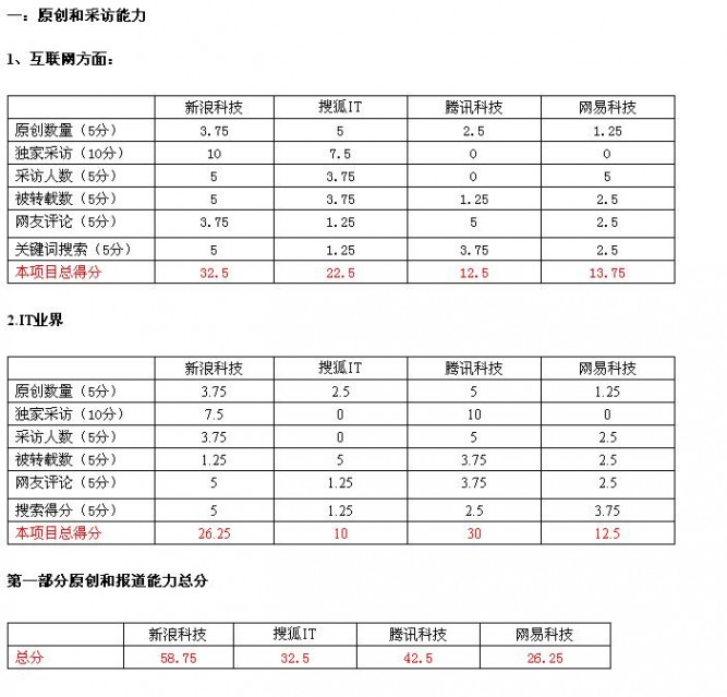 通过一个月的监测,我们从报道能力、采访能力和策划能力以及网友的互动情况等对门户网站科技频道进行了一个横向的比较和打分,总分定位100分。