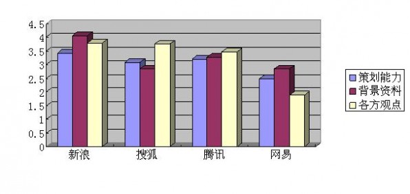 在互联网选题和文章的策划方面,新浪科技的综合能力强于其他三家,其中以背景资料的制作最为突出。而搜狐IT方面策划能力和背景资料的制作稍微欠缺,腾讯科技三方面能力相对平稳差距不大。网易科技综合表现最差。