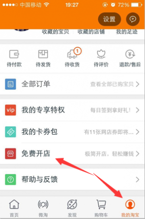 2:然后打开“手机淘宝”,点击右下角的“我的淘宝”,再点击“免费开店”如下图所示(备注:如果你的手机淘宝没有“免费开店”,说明你的手机淘宝该更新版本了)
