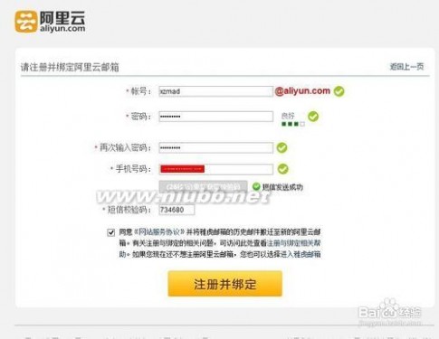 跳出了绑定和注册阿里云的页面,填写自己的信息(要手机验证码),点击注册并绑定。