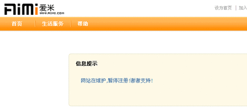 开源插件网讯 1月11日消息, 近日有爱米网的注册网友爆料说爱米网已经暂停了新用户的注册。我们随即登陆爱米网并点击注册页面查证,发现注册框已经消失了,只看到一行提示“网站在维护,暂停注册!谢谢支持!”,如下图所示: